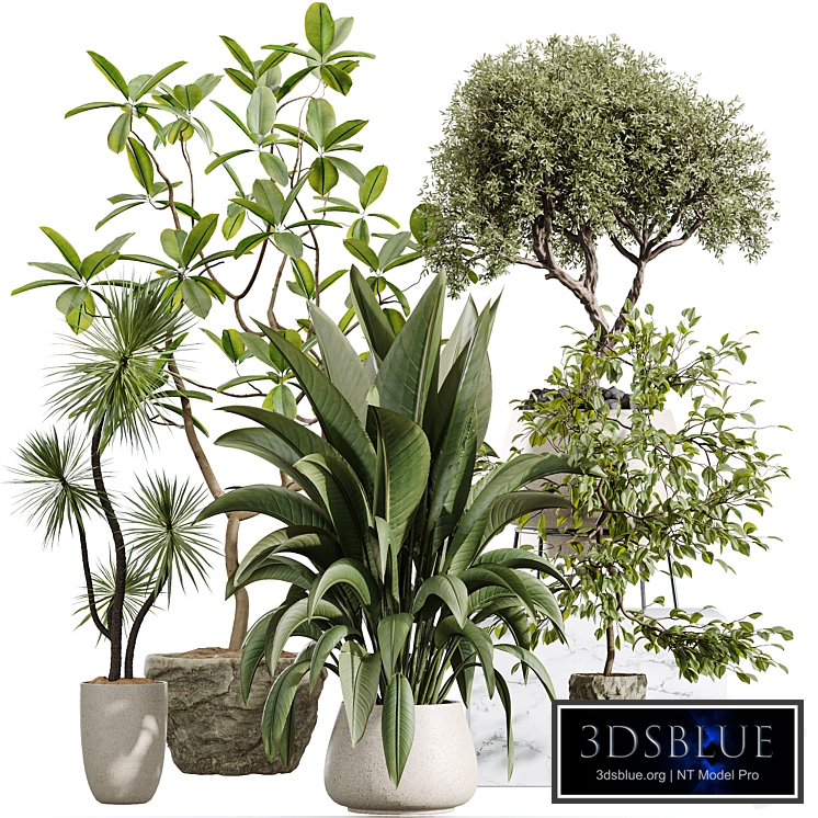 A sculptural indoor quintet balancing tropical volume with Mediterranean texture. Ficus marginata arcs with slender, matte leaves on sinuous stems; Bird of Paradise delivers bold, ribbed fans; Spineless Yucca (Y. elephantipes) adds dynamic, radial crowns; the Olive tree contributes a fine, silvery canopy; and Clusia rosea (Autograph Tree) grounds the set with thick, oval leaves and clean branching. Pots keep one coherent palette—hand-textured stone vessels, smooth mineral ceramics, and a marble plinth—ensuring a unified material identity across all five plants. Technical Specification Highest altitude: 210 cm 1- Materials is archive (material library) Corona mtl + Vray mtl + Standard mtl 2-Polys:992162 + Verts:1265935 3- 4K texture + 4K material 4- JPEG (texture), MAX + MTL + FBX 2014 5- 3dmodels: MAX + FBX 2014 6- Corona render (Renderer Engine-MAX + FBX) 7- Models have unwrapped overlapping and maps supported traditional 3ds Max texturing. Note: - To use the max file you need to use at 3dsmax 2015 - Units: Millimeter - Clean Topology (quad mesh) - You Can Add Turbo Smooth Ready for villas, hotel lobbies, and editorial interiors—clean shading, unified planters, and scene-friendly topology. If you have any problems for setting up the models, send me a message here.