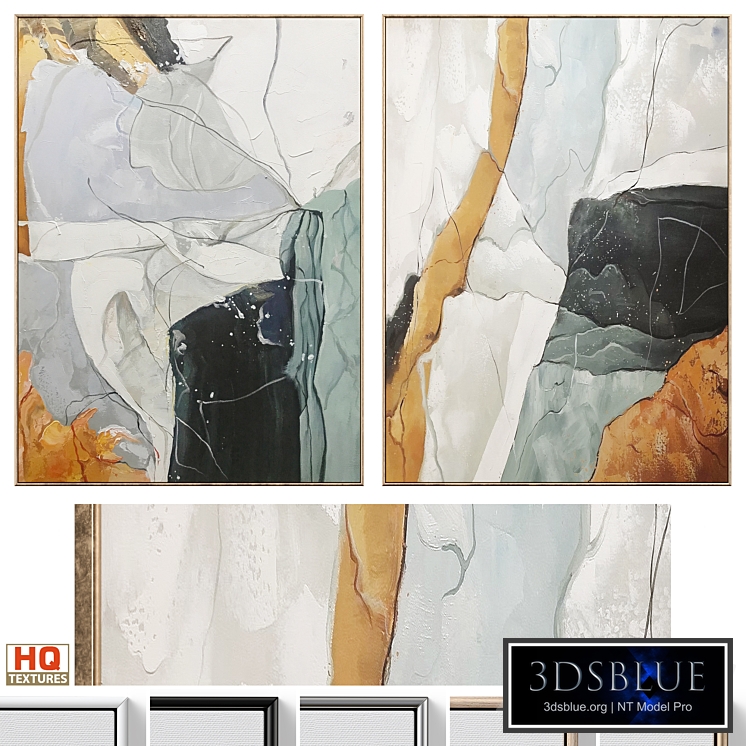 A set of paintings on canvas in a modern style Modern Contemporary Living Room Orange Green Accent Textured Abstract Neutral Canvas Paintings WHAT'S INSIDE? - 2 Framed Canvases X 5 Different Materials - 5 Groups: White, Black, Silver, Wood, Gold - HQ Textures Res. --- 2620x1966px, 2000x1500px - Files 3dsMax 2011, 2014, 2017 --- VRay, Corona - Interchange Format Files --- OBJ, FBX, 3DS * Correct topology and optimized number of polygons * All the objects of the model are named * All the materials and textures are named *Easy customizable Multi-Sub material * Unwrapped UVs * 362 Polygons and 364 Vertices per Piece FRAME SIZES 100 x 135cm / 39''x53'' Similar models: https://3dsky.org/3dmodels/show/large_accent_abstract_textural_wall_art_c_794 https://3dsky.org/3dmodels/show/framed_canvas_c_64 https://3dsky.org/3dmodels/show/framed_canvas_c_55 https://3dsky.org/3dmodels/show/peach_green_brushstrokes_large_accent_abstract_wall_art_c_535 https://3dsky.org/3dmodels/show/large_living_room_wall_art_c_281