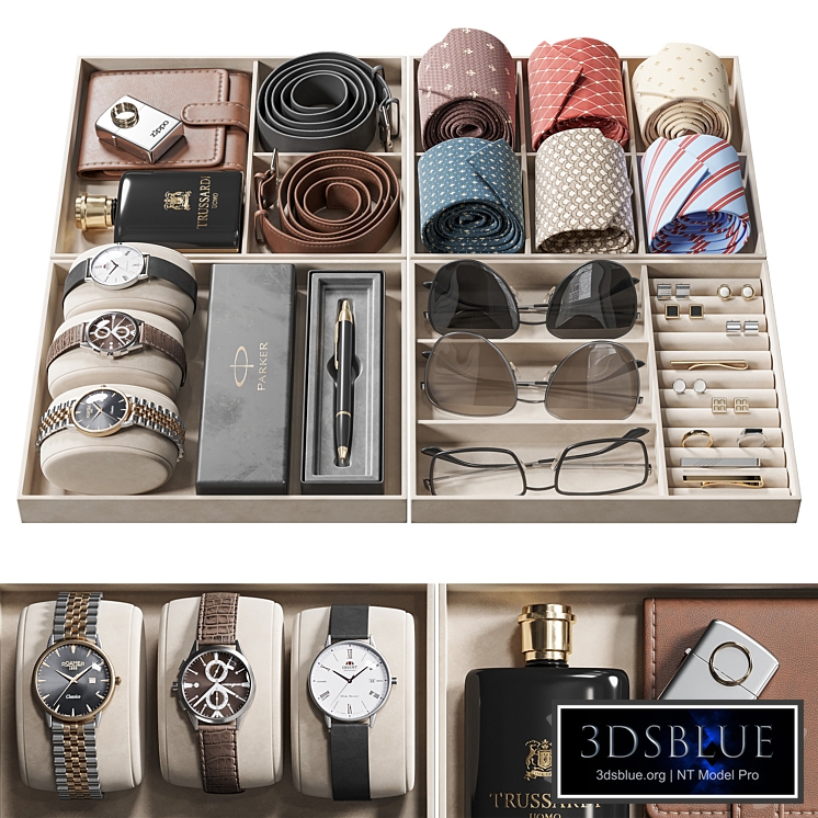 1149 NG20 Men's Accessories Organizer with men's accessories, for filling closets, cupboards, dressers, drawers The female companion set is here https://3dsky.org/3dmodels/show/aksessuary_dlia_zhenshchin_ng21 The set includes a tie, belt, sunglasses, Trussardi Uomo men's perfume, Zippo lighter, wristwatch with leather and metal straps, wedding ring, signet ring, cufflinks, tie clip, purse, leather, stitching, gift-wrapped Parker pen. The size of one organizer is 21*25 cm, only 4 pieces, grouped separately for convenience, have logical names. Overall size of the set 50*42*6 See Archived: MAX2016(corona4/vray4) + OBJ + mtl + Texture Vray materials were obtained by converting 42981 polygons XForm, there is a scan. The pivot is configured. Turbosmooth has added some elements (0 iterations in viewport, 1 iteration in render). In OBJ without smoothing. All models are suitable for smoothing. Perhaps you were looking for filling, wardrobe, dressing room, costume jewelry, accessories, organizer, haberdashery, decor, men's, for men, drawer filling, wardrobe, chest of drawers