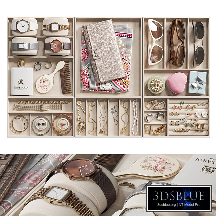 1150 Organizer with women's accessories, for filling closets, cupboards, dressers, drawers, dressing table The men's companion set is here https://3dsky.org/3dmodels/show/aksessuary_dlia_muzhchin_ng20 The set includes costume jewelry, jewelry, wristwatches, metal and leather strap, Trussardi Donna perfume, comb, vintage mirror, clutch, bag, silk scarf, scarf, sunglasses, jewelry box with bow, bracelet, earrings, earrings, ring, pendant, chain with pendant, beads, large earrings, diamond, jewelry, costume jewelry, haberdashery, women's set, for women, shop, showcase, jewelry The size of the organizers is 21*25 cm and 21*12 cm. The overall size of the set 63*37*6 See Archived: MAX2016(corona4/vray4) + OBJ + mtl + Texture 81962 polygons XForm, there is a scan. The pivot is configured. Turbosmooth is applied to some elements (0 iterations in viewport, 1 iteration in render). In OBJ without smoothing All models are smoothed. Perhaps you were looking for filling, wardrobe, dressing room, costume jewelry, accessories, organizer, haberdashery, decor, men's, for men, drawer filling, wardrobe, chest of drawers