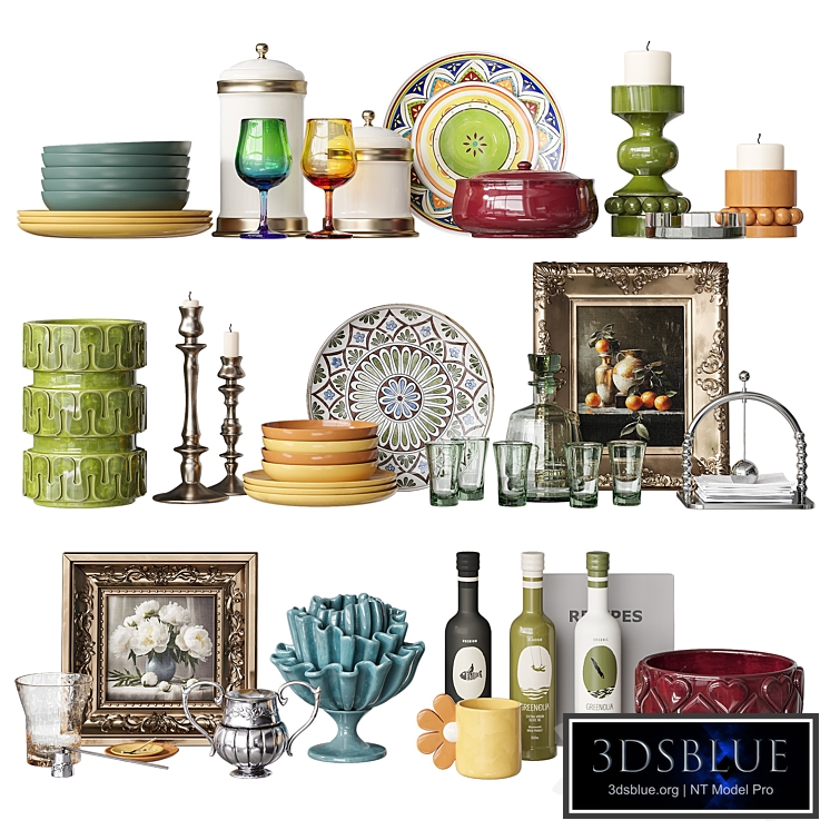1129 Set of dishes and decor for filling shelves in the kitchen NG9 The overall dimensions of the set are approximately 107*98*28 cm The set is suitable for serving, for the kitchen, dining area, sideboards, racks, buffets, shelves in the kitchen, aesthetics, filling shelves, dining room, living room, serving, dishes, utensils, plates, glasses, mug, cup, sunflower oil, beautiful bottle, silver, jar for bulk products, soup tureen, bright decor, accent, stack of plates, decanter, wine glass, vase, candles, decorative plate, framed picture, napkin holder, gold, chrome In the archive: MAX2016(corona4/vray4) + OBJ + mtl + Texture 55329 polygons XForm, there is a scan. Pivot is configured. Turbosmooth is thrown on (in viewport - 0 iterations, on render - 1 iteration). In OBJ, the stack is collapsed. Vray materials are obtained by conversion.
