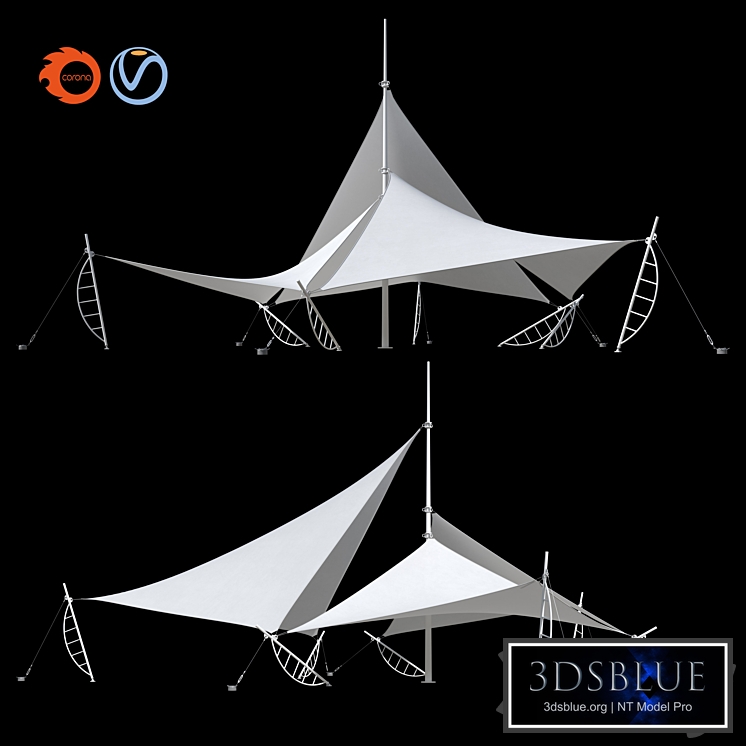Fast-erecting awning structure on a central support, with a wide range of applications. Perfectly will be suitable both for the exhibition purposes, and for festive city actions, and the organization of summer cafe. There is a TurboSmooth modifier in the scene - 1-2Render iters, the stack is not collapsed, for close-ups, anti-aliasing can be raised up to 2 iterations. There is no modifier in the export file. File Format: - 3ds max 16 corona render - 3ds Max 16 vray -OBJ Those who work in V-Ray versions lower than 3.1, be careful, in the materials in the BRDF section there is Microfaset GTR ( GGX ), if your version is older than 3.1, then the BRDF field will be empty. Choose Blinn, Phong or Ward - whatever suits you best. For Corona render, it is recommended to install a version of at least 1.5, since the glossiness of materials is configured with PBR in mind.