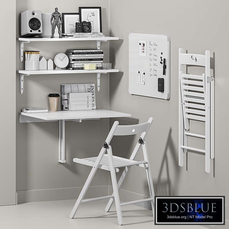 Balcony Workplace IKEA Includes: - folding table IKEA NORBERG (WxHxD) - 740x430x600 mm (article IKEA NIRBERG - 301.805.04) - shelf IKEA BERGSHULT (WxHxD) - 800x20x300 mm (article IKEA BERGSHULT - 404.000.44) - fasteners for shelves IKEA SIBBHULT (WxHxD) - 30x180x180 mm (article IKEA SIBBHULT - 104.177.34) - folding chair IKEA TERJE (WxHxD) - 440x770x510 mm (article IKEA TERJE - 402.224.43 ; 202.224.44) - marker magnetic board IKEA VEMUND (WxH) - 700x500 (article IKEA VEMUND - 903.022.82) - Lintex Accessory kit. A set of accessories consisting of markers with black ink, magnets, a spray bottle for cleaning with water, a magnetic bottle holder, an eraser for boards and magnetic holders for each individual pen. (article Lintex - 40445) - apple iphone 12 pro max - Zenit TTL camera - decorative vases Lyngby vase Copenhagen - office supplies - books and magazines - decor ----------------------- the models have a UV scan on the 1st channel in 1 UDIM, there is a UV overlay in order to increase the texel, some textures use an additional UV channel. Custom normals are applied on models, in case of problems when editing models, it is necessary to apply the Edit Normals modifier and apply Reset to all normals. The color of the furniture (NORBERG/BERGSHULT/TERJE) is determined by the material ID (ID_1 is white, ID_2 is black for wood). You can also replace the diffuse/albedo color with the desired one. ----------------------- polygons: 731209 textures: 82.5 MB Archive composition: -max 2014 vray -max 2014 corona -obj -mtl -textures ----------------------- Who works in a V-Ray version lower than 3.1 be careful, there is a Microfaset GTR ( GGX) in the materials in the BRDF section, if your version is older than 3.1, then the BRDF field will be empty. Choose Blinn, Phong or Ward – which is preferable for you For Corona render, it is recommended to install a version not lower than 1.5, since the glossiness of materials is configured with PBR in mind.