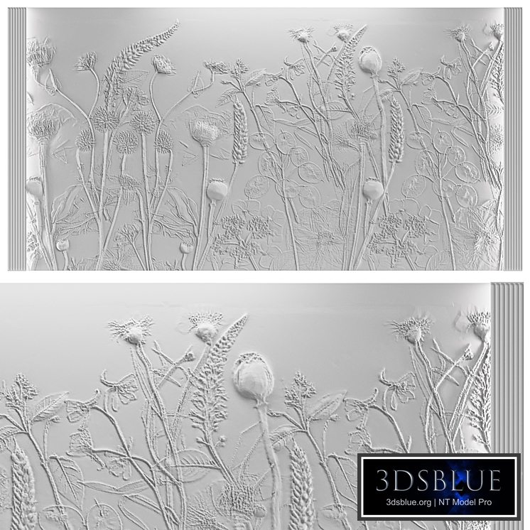 IMPORTANT: You can use only part of the Bas-relief by adding the Slice modifier, adjusting the length to your wall size! The archive contains the 3dsMax 2021 version file +Fbx Material made with CoronaPhysicalMtl The mesh is triangulated to reduce polygon count and maintain detail. Bas-relief size: D: 5855mm H: 3000mm The bas-relief depicts typical meadow and field plants. Here one can distinguish the inflorescences of red clover (Trifolium pratense), the rounded capsules of the poppy (Papaver rhoeas), the ears of rye (Secale cereale) and soft wheat (Triticum aestivum). Among the thin stems one can guess the graceful inflorescences of yarrow (Achillea millefolium), the airy umbrellas of sweet clover (Melilotus albus), the spherical heads of thistle (Cirsium vulgare) and the light branches of the moon grass (Lunaria annua) with their characteristic rounded "silver coins". The floral composition conveys the richness of the meadow flora, preserving it in relief as a natural herbarium, where every detail – from the ear to the inflorescence – embodies the natural harmony of plants and their fragile beauty. Possible Description: Botanical Bas-relief, Bas-relief Grass and Ears, Bas-relief Garden, Bas-relief Field, Bas-relief Summer, Bas-relief Plants, Bas-relief Field Grasses, Bas-relief Cereals and Flowers, Bas-relief Meadow Flora, Bas-relief Poppy and Soft Wheat
