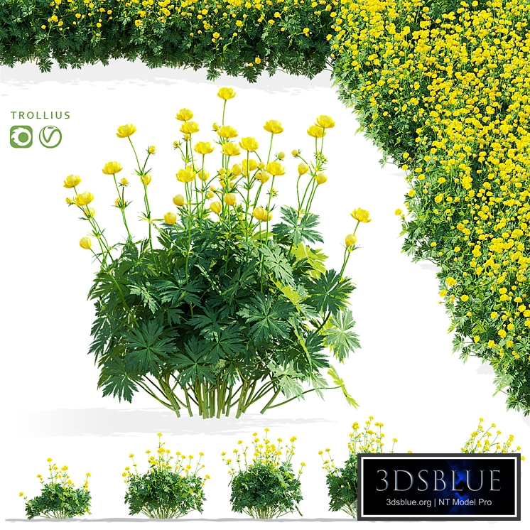 Total Polys 367 211 Verts 423 578 Trollius_flower_001 Polys: 38435 Size: X: 50 cm. Y: 52 cm. Z: 44 cm. Trollius_flower_002 Polys: 72694 Size: X: 60 cm. Y: 61 cm. Z: 60 cm. Trollius_flower_003 Polys: 80861 Size: X: 59 cm. Y: 47 cm. Z: 63 cm. Trollius_flower_004 Polys: 86113 Size: X: 66 cm. Y: 60 cm. Z: 72 cm. Trollius_flower_005 Polys: 89108 Size: X: 65 cm. Y: 54 cm. Z: 71 cm. Archive include: 3ds max 2012 3ds max 2012 Corona OBJ (by material) FBX 2012 standart material(5 separate files) V-ray mat Corona mat Textures Have a nice use!