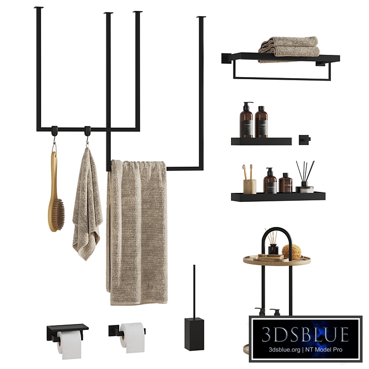 Other bathroom models http://3dsky.org/collection/shared/5377679 A set of bathroom accessories in modern black color. The set includes everything that is presented on the render: - ceiling TENSI towel holder of two types (60 and 80 cm high) with hooks https://metallbude.com/en/collections/bathroom/products/towel-rack-tensi - towels, massage brush; - hanging shelf with towel; - round two-level table NORM TABLE with all the contents https://inbani.com/en/products/norm-table-freestanding-circular-table / - shelves with all the contents: a glass with toothbrushes, bottles, an aroma diffuser; - towel hook; - hanging brush; - toilet paper holder; - toilet paper holder with phone stand; ————————————— Version of Corona 7 CoronaLegacyMtl materials Units of measurement: mm All objects, textures, and materials have logical names. The paths to the textures have been reset.