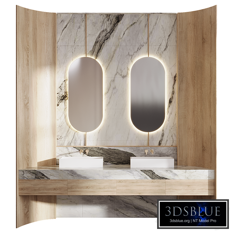 Units: Millimeters Dimension: 2584.95 x 777.96 x 2884.92 Polys: 13,433 Bathroom Furniture 9 is a luxurious and contemporary vanity set that blends natural elegance with modern design, creating a stunning focal point for any bathroom. The unit features a sleek marble wall with intricate gray and white veining, providing a sophisticated and timeless backdrop enhanced by subtle LED lighting around the edges. Integrated into a matching marble countertop are two rectangular white ceramic basins, offering ample space for daily use with a glossy, pristine finish. Wall-mounted gold faucets with minimalist spouts deliver precise water flow, adding a touch of opulence to the design. Above the vanity, two large oval mirrors with thin metallic frames reflect light, amplifying the sense of space and adding a refined aesthetic. The lower section includes a light wood cabinet with a smooth finish and multiple drawers, providing practical storage while maintaining the unit's streamlined look. Built for durability and easy maintenance, Bathroom Furniture 9 combines functionality with high-end style, making it an ideal choice for a luxurious bathroom upgrade.