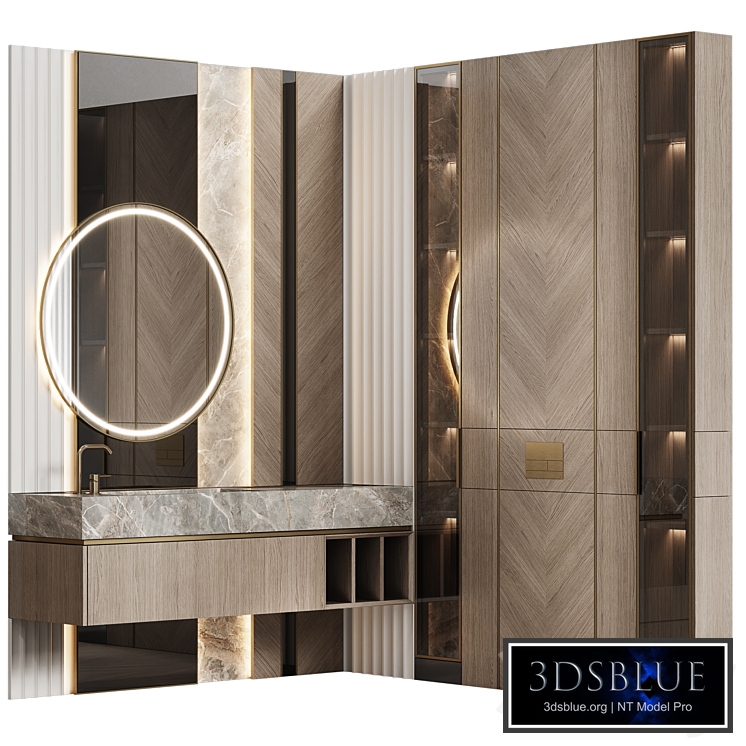 Bathroom furniture 39 modular in a modern minimalist style CORONA Legacy Materials! 3ds Max 2016! Description. Corner furniture composition for the toilet and bathroom: - custom-made furniture (cabinet, cabinet for installation), - a round mirror with backlighting, - Antonio Lupi Velo countertop washbasin, - Tece Square II flush button, - Gessi Flessa mixer. Suitable for interiors: Scandinavian, modern classic, minimalism, art deco. The scene features 3 color options, shown in the preview.