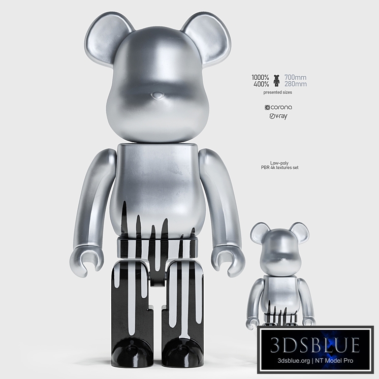 3D model name - 33B_23_KRINK #bearbrick69 - by this hashtag you can see all the bears made by me. _ - Collaboration of Bearbrick with KRINK - The model features Bearbrick "1000%" and "400%" PBR textures 4096x4096 jpeg - Diffuse / Glossiness / IOR / Reflection / Normal Version: 2013/2016 Units: Millimeters Polys total: 15,660 XForm: yes Render preview: Corona Formats: 3Ds Max 2013/2016 (Corona 6 / Vray 3.6), FBX (Corona / Vray), Obj, MTL The model was created - 3Ds Max 2018 (Corona 6) Textures with an individual name in English All models are configured with Unwrap UVW