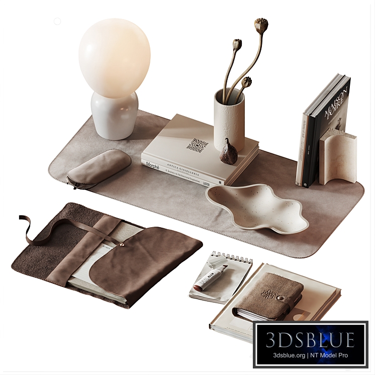 Beige modern neutral workplace decor set 28 Desk (work place) / coffee table decor Polys 379 313 Verts 396 172 The set includes: • Dried flower in a vase (poppy/bud) • Decorative dried fruit • Zara stone bookend bookend (travertine) https://www.zara.com/us/en/travertine-stone-bookend-p49361043.html?v1=422468563 • Vase (irregular/ curve / wave form) • Notebook organizer diary planner beige leather with button (colour mocca mousse) • Notepad (leather, stitching, embossing) • Sheets / notes • Stationery / office supplies (copic sketching marker / spiral notebook) • Buddy Table Lamp (sand / opal) https://royaldesign.com/us/buddy-table-lamp-v141854 • Buffet / work table pad (leather) • Spectacle case (suede, leather), glasses • Coffee table book There is displace in leather materials (blotter/notebooks/eyeglass case), book stands, dried fruit. For correct and more detailed display It is recommended to set the parameter in the tab Render Setup - Performance - Displacement - Screen size 1.0 px The export file contains objects without anti-aliasing. Some objects are for smoothing, Mesh smooth stack is not collapsed (instance)