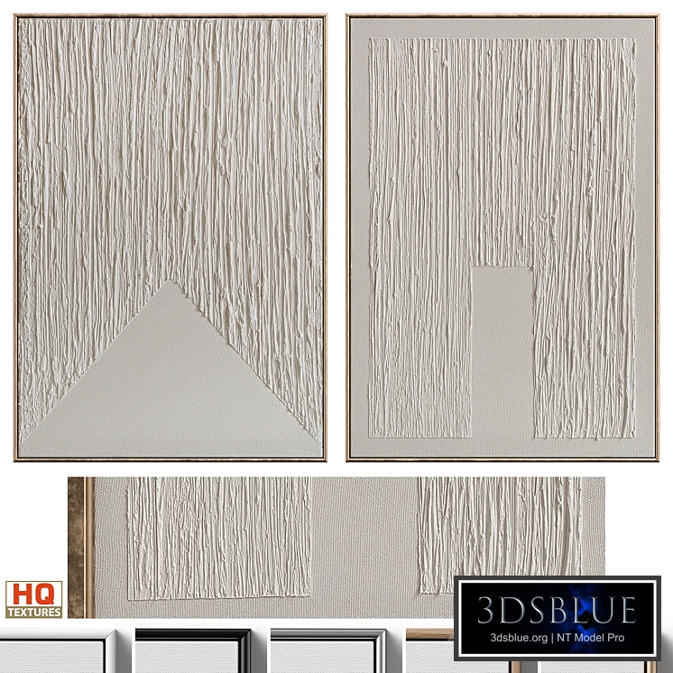 A set of plaster paintings in a modern style Two Large Boho Living Room Beige Textural Plaster Abstract Neutral Wall Art Canvas Paintings * Extrusion done using the Normal map WHAT'S INSIDE? - 2 Framed Canvases X 5 Different Materials - 5 Groups: White, Black, Silver, Wood, Gold - HQ Textures Resolution --- 2376x1648 px, 1958x1358 px - Files 3dsMax 2011, 2014, 2017 --- VRay - Files 3dsMax 2011, 2014, 2017 --- Corona - Interchange Format Files --- OBJ, FBX, 3DS * Correct topology and optimized number of polygons * All the objects of the model are named * All the materials and textures are named *Easy customizable Multi-Sub material * Unwrapped UVs * 362 Polygons and 364 Vertices per Piece FRAME SIZES 70 x 100 cm / 28''x 39'' Similar models: https://3dsky.org/3dmodels/show/mid_century_abstract_textural_plaster_wall_art_c_421 https://3dsky.org/3dmodels/show/mid_century_beige_textural_plaster_wall_art_c_454 https://3dsky.org/3dmodels/show/framed_canvas_c_134 https://3dsky.org/3dmodels/show/abstract_arch_plaster_wall_art_c_226 https://3dsky.org/3dmodels/show/large_beige_textural_plaster_wall_art_c_456