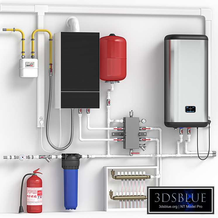 The model shows a boiler room, elements of a boiler room in a private house; Boiler gas floor Buderus Logamax Plus GB172-42i, storage water heater Thermex ID 80-V; Real world size (system blocks - mm) All previews are rendered in 3ds max corona; The model is completely ready to use visualization in 3ds max Corona; W.2500mm x D.400mm x H.2500mm; Polys: 594617 Verts: 624400 The archive contains: - max 2015 (Corona 5) -FBX -OBJ -textures