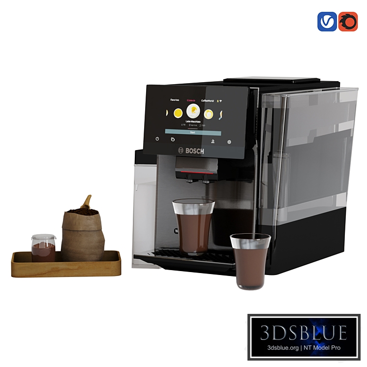 This model contains “TQU60307 Fully Automatic Espresso Machine “ and accessories Some materials are PBR --------------- 3ds max version: 2020 Corona version: 7 Vray version: 5 ---------------- Polys: 64000 Verts: 65000 --------------- Website: https://www.bosch-home.com/