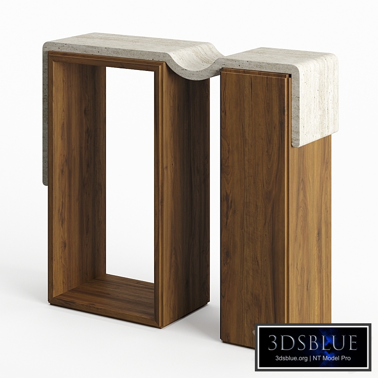 A travertine stone slab drapes and stretches across the wood console bases, unifying the three elements into a single piece. The curved stone section serves as a nice catch-all. Part of the Melt Collection; a continued exploration of reality vs. perception through material and form. Materials: Walnut base, travertine top Dimensions: 40 x 12 x 36 in