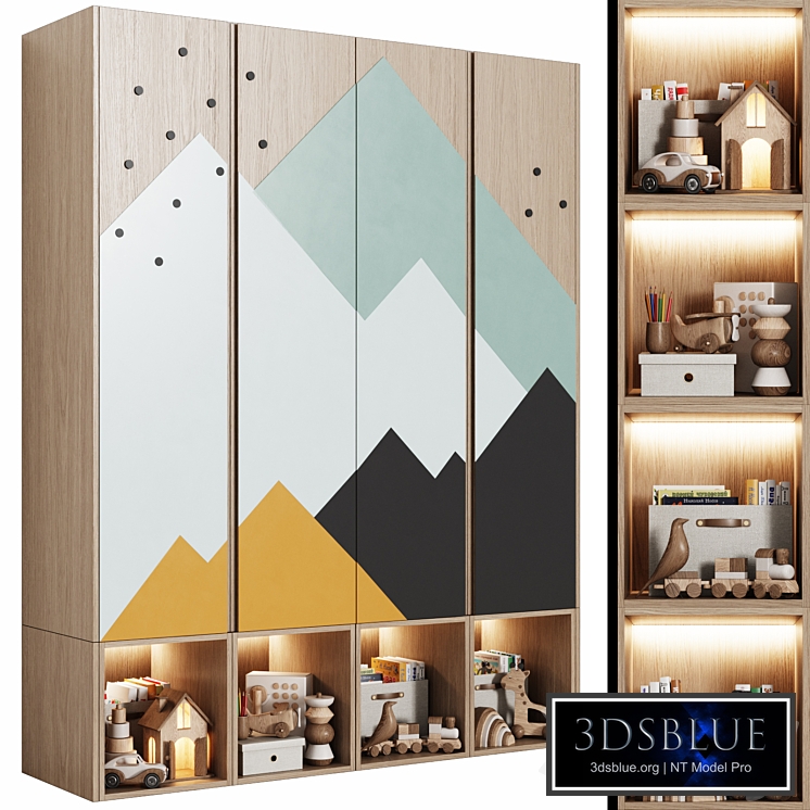 Bright colored children's modular wardrobe "Mountains" in a modern minimalist style 12 Description: CORONA and V-RAY materials! (vray materials were obtained by converting corona materials without modification!). Suitable for interiors: Scandinavian, minimalism, Japandi, wabi-sabi. Facades with an integrated handle throughout the entire height of the facade. Facades with applied colored “mountain” decor made of painted plywood. At the bottom of the cabinet there is an open shelving unit with decor. The cabinet consists of two separate modules and is easy to edit. Custom made cabinets. The scene contains all the decor (wooden toys, books, boxes) that is in the preview.