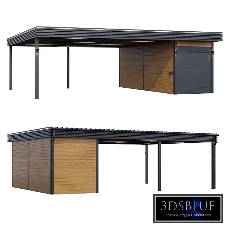 Canopy for two cars with utility block. Parking area: 6m x 6m Utility block area: 6m x 2m Total height of the model: 2.7m One object, one Multi/Sub-Object material with logical names. Polys: 17572 Verts: 19488 Units: millimeters