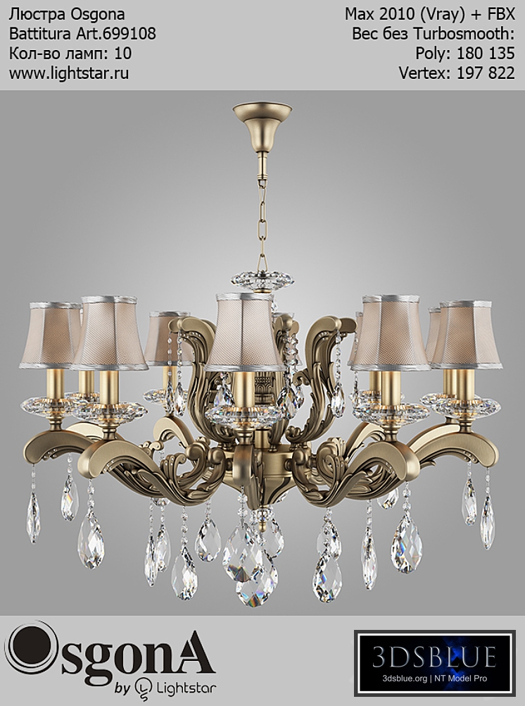 Chandelier Osgona Battitura Art.699108 Number of bulbs: 10 www.lightstar.ru Mach 2010 (Vray) + FBX Weight without Turbosmooth: Poly: 180135 Vertex: 197822 Hi-poly. The material exhibited crystal dispersion, which increases render time, if not necessary - disconnect. Note from Lightstar: "The model comes order"