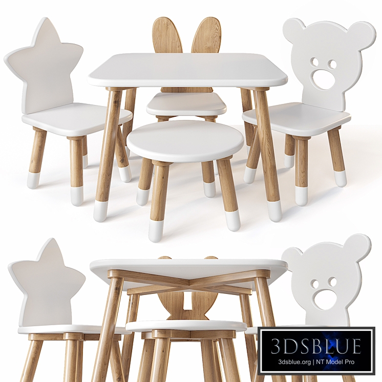 3d model of a table and chairs for a children's room from Kacheli Kids Studio. - Table Square 60x60 cm - Chair Star 26 cm - Chair Bear 26 cm - Chair Ushastik 26 cm - Stool 26 cm File Formats: - 3ds Max 2013 V-Ray - 3ds Max 2013 Corona Renderer - FBX (Multi Format) - OBJ (Multi Format) - 3DS (Multi Format) Polys: 24366 Verts: 24446
