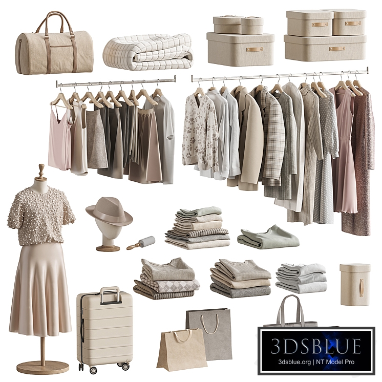 1028 Filling for wardrobe, closet, hallway, bedroom BUMERANG Ikea hangers, a cover for clothes, a shirt, a shirt, a coat, a blouse, a top, a cardigan, a dress, a sweater, a blouse, a jacket, a skirt, trousers, boxes for clothes, Zara Home, a package, a hat, a wool roller, a suitcase, a pillow, a blanket, a sports bag, a mannequin, a dress on mannequin, evening dress, Hat stand, handbag Less, Basic bag, Travel bag, barbell, folded clothes, filling, wardrobe, bedroom, closet, dressing room, closet filling, beige, black and white Overall dimensions of the composition 360*64*280 See In the archive: MAX2016(corona/vray) + OBJ + mtl + Texture 372680 polygons XForm, there is a scan. Turbosmooth is loaded (0 iterations in viewport, 1 iteration in render). In OBJ without Turbosmooth to save money