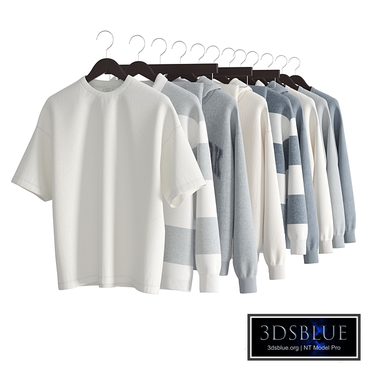 A set of men's sportswear on hangers to fill a wardrobe or store. The set includes a T-shirt, pants, sweatshirts, and hoodie. The archive contains files 3ds max 2018 Corona 6, 3ds max 2018 V-ray 5, obj, mtl, PBR textures with a resolution of 4096 by 4096. The preview renders were created in Corona Render 6. Objects and materials are named logically. Turbosmooth has been applied to some objects (0 iterations in the viewport, 1 iteration in the render). The number of polygons in the entire scene Polys: 329869 Verts: 335965 Units: Centimeters