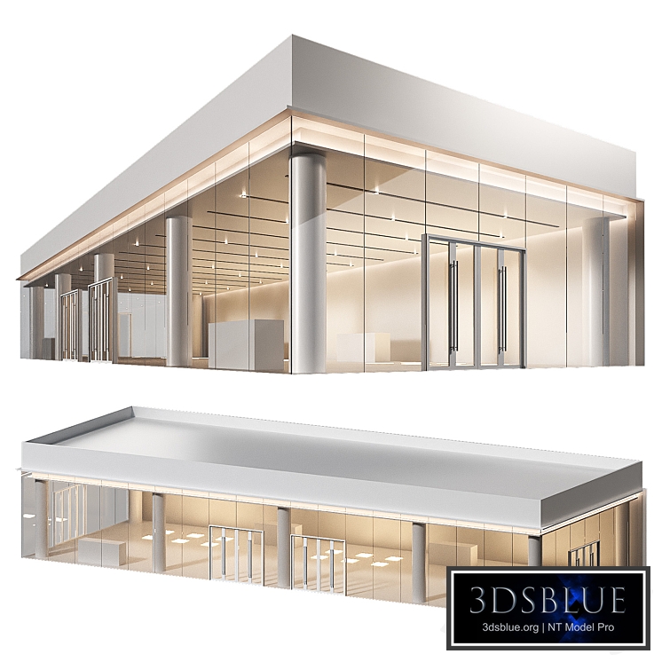 The 3D model contains a modern commercial building with panoramic glazing. A small shopping mall, an exhibition hall, a showroom, a pavilion, a museum, a gallery. Luminous letters of the building name. Can be used as the first floor of the building. The interior decoration consists of lighting and columns. The entrance group includes swing doors. Fully modular design - easy to edit. The scene is optimized for fast loading, there are no hidden or garbage objects. Files present: .MAX .FBX .OBJ
