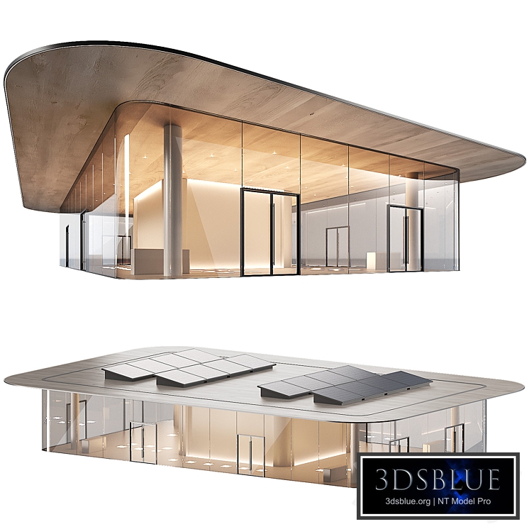 32m x 21m x 5,5m The 3D model contains a modern commercial building with panoramic glazing with rounded corners. A small shopping mall, exhibition hall, showroom, pavilion, museum, gallery, boutique. Can be used as the first floor of a building. The interior decoration consists of lighting, columns, and backlighting. Wooden wide roof with solar panels. The entrance group includes swing doors. Fully modular design - easy to edit. The materials used are supported in all versions of Corona and V-Ray. Files present: .MAX .FBX .OBJ You can find other modern buildings in my profile.