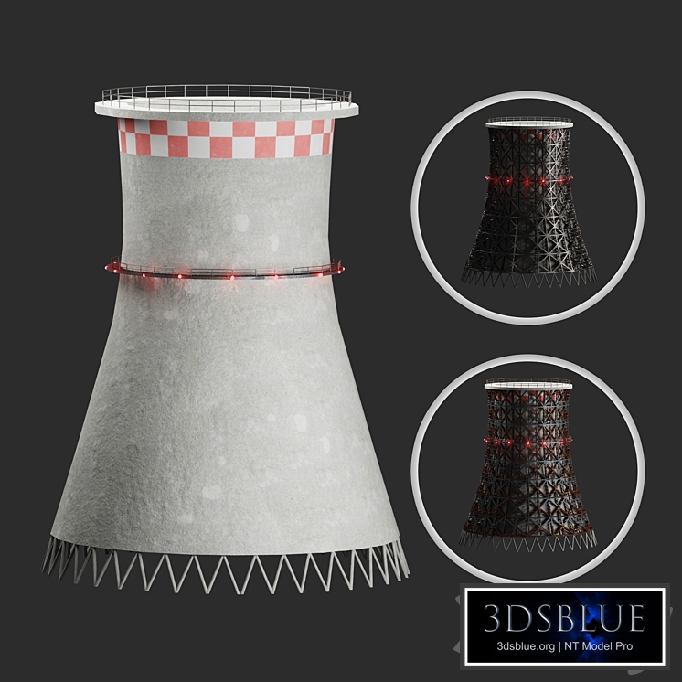 Cooling tower for power plants, chemical plants and other enterprises where large quantities of water cooling is required. Perfect for the exteriors of the industrial area. There is a model with and without a metal frame. Suitable for medium to long angles. For a cooling tower with a metal frame: Polys: 194,406 Verts: 171,340 For frameless cooling tower: Polys: 13,446 Verts: 11,596