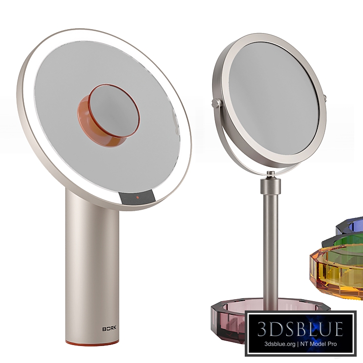 A set of modern cosmetic mirrors 1. Cosmetic mirror BORK F785 with backlight https://www.bork.ru/eShop/Beauty-Care/f785/ Dimensions: D = 240mm H = 390mm 2. KRISTAL cosmetic mirror by Decor Walther https://www.decor-walther.com/ru/product/0942097 Dimensions: D = 150 mm H = 390-510 mm 4 colors in the archive, more colors available from the manufacturer Materials are configured for Corona Renderer (Legacy PBR + CoronaPhysicalMtl), Vray (GGX) OBJ in the archive