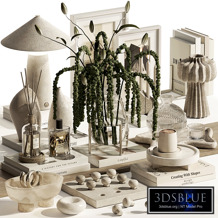 A highly detailed 3D model collection for interior visualization. This set includes a variety of modern home decor objects such as vases, glassware, table decor, books, candles, and unique natural-style plants, perfectly suited for contemporary and minimalistic spaces Format: 3Ds Max 2013 + OBJ export Render Engines: V-Ray, Corona (materials included) Polygons: 746327 Vertices: 823614 Units: Millimeters Dimensions: 996.75 x 1216.46 x 552.19 mm Optimized for realistic interior renders, this set is ready to use in your projects to add detail, elegance, and a natural atmosphere to any scene.