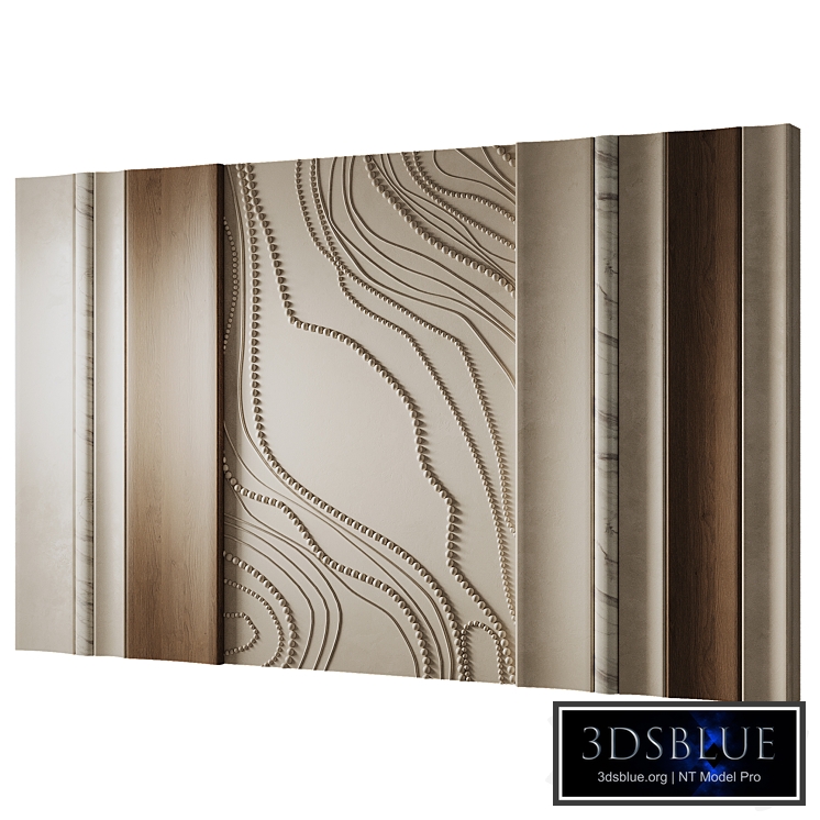 A custom-made decorative wall panel with a 3D relief pattern and wood and stone accents. The soft, flowing lines combined with contrasting materials create a striking accent in a modern interior. Suitable for walls in reception areas, hallways, living rooms, and bedrooms.