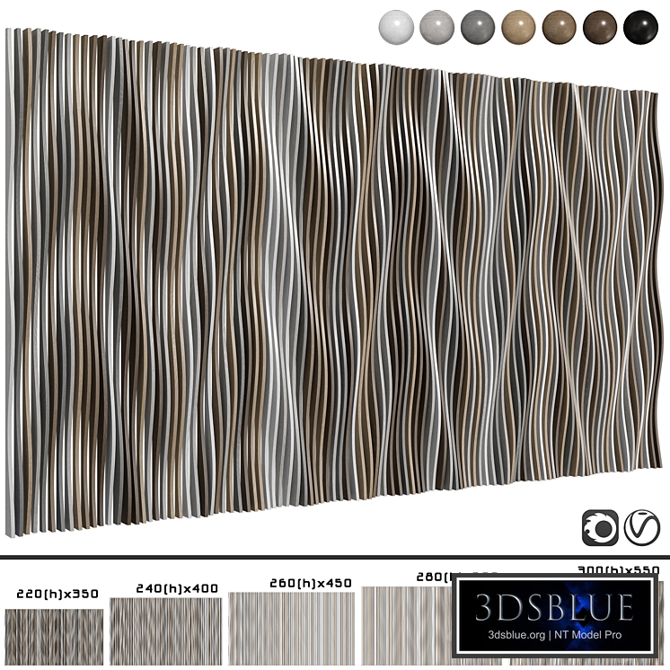 Decorative parametric panel made of slats for walls and ceilings ================================= In the scene: -5 models of decorative panels. -7 options of wooden coverings. -The standard MaterialByElement modifier allows you to change the colors of the slats at your discretion. ================================= Dimensions (Height/Length): -220x350cm -240x400cm -260x450cm -280x500cm -300x550cm ======================== I can make it to order according to your measurements. ======================== Format: -3ds max 2015 (V-ray), -3ds max 2015 (Corona), -3ds max 2018 (V-ray), -3ds max 2018 (Corona), -3ds max 2021 (V-ray), -3ds max 2021 (Corona), -3ds max 2024 (V-ray), -3ds max 2024 (Corona), -Fbx (V-ray), -Fbx (Corona). ================== Render: V-ray & Corona ================== All files are archived.