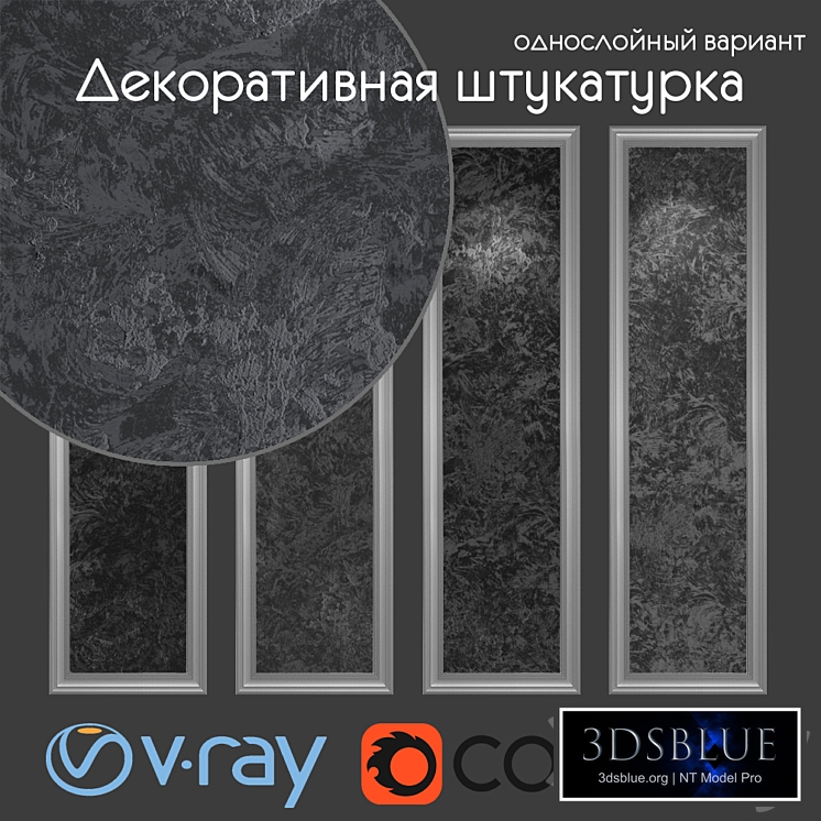 One-layer material of embossed Venetian plaster. Embossed Venetian plaster is a very popular stone imitation finish. The plaster is applied with a spatula, sanded out, and then sanded to a shine. Creates the effect of coolness and strength of marble palace halls. There are textures, resolution 3072x3072 pix. The archive contains seamless textures, material files and 3ds max 2011 files for corona and v-ray.