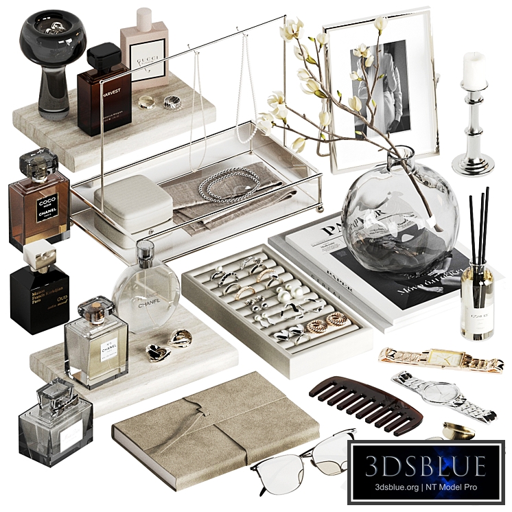 Decorative set with perfume and jewelry for a dressing table or coffee table. Polys: 304936 Verts: 306243 In the archive: Max 2021 V-ray max 2021 Corona fbx Corona fbx V-ray obj/mtl textures