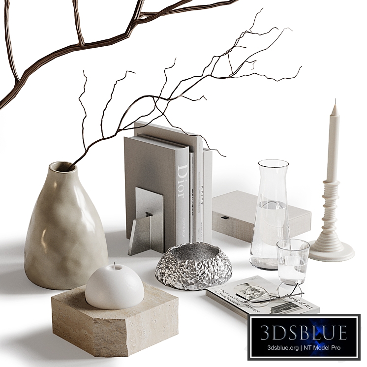 Decorative set for the living room, bedroom, hallway. For coffee, bedside table. Vase with a branch, book, magazine, candle, decanter with water. In the archive: - max 2017 (Corona 7) - max 2017 (VRay 5) - O.B.J. - jpg Units: mm Pre-rendering using Corona. Texture paths have been reset. Textures are named with unique names. Pivot point at the bottom point. The turbosmooth modifier is partially applied to the model (display in the viewport - 0 iterations, on the render - 1 iteration). There is no modifier in the OBJ file. Those who work in a V-Ray version lower than 3.1, be careful, in the materials in the BRDF section there is Microfaset GTR (GGX), if your version is older than 3.1, then the BRDF field will be empty. Choose Blinn, Phong or Ward - whichever is preferable for you. For Corona render, it is recommended to install version no lower than 1.5, since the glossiness of the materials is adjusted taking into account PBR.