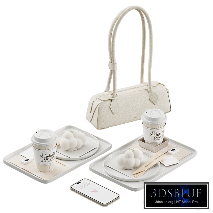 Decorative set, coffee set _________________ Materials: CoronaLegacyMtl, Vray Units of measurement - millimeters The previews are made in version - Corona 10 For Corona render, it is recommended to install a version not lower than 1.5, since the glossiness of materials is configured with PBR in mind. ! Vray materials - obtained using Vray converter Those who work in V-Ray versions lower than 3.1 be careful, the materials in the BRDF section contain Microfaset GTR ( GGX), if your version is older than 3.1, then the BRDF field will be empty. Choose Blinn, Phong or Ward – which is preferable for you _________________ Some items have the Turbosmooth modifier applied (during rendering) Set contents: craft paper cup, coffee, phone, apple, disposable tableware (fork, knife), mousse dessert, disposable napkin, plate, tray, Alaia bag