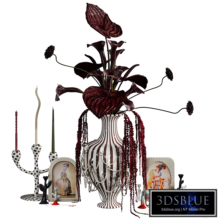 Decorative set with flowers includes: Bouquet: - 4 Anthurium flowers - 10 flowers of Kal - 3 Scabiosa flowers - 3 branches of Amaranthus Decor: - 6 ceramic sculptures - 2 pendants - 2 paintings - 1 Candlestick - 1 classic vase with chains and pearls Lowpoly model with one TurboSmooth iteration.