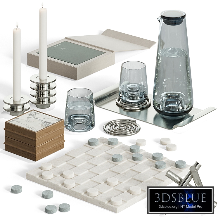 Decorative set with marble chessboard. Metal candlesticks, candles, vintage sculpture, decanter with glasses on a tray, book in a box, wooden boxes. sss works on marble materials. All my models are optimized, made for smoothing (where it is needed), it is possible to regulate the number of iterations. Similar objects are multiplied via Instance, there is no unnecessary geometry and unjustifiably heavy maps. Archives are as light as possible without losing quality, objects and materials are logically named. The archive contains a 3ds max 2021 scene for Corona and V-Ray + fbx and obj files. Materials for Vray are created using Vray Converter. Renders for the preview were made in Corona Render 10. On the Corona Legacy Mtl. For Corona render, it is recommended to install version no lower than 1.5, since the glossiness of materials is configured taking into account PBR Those who work in V-Ray version lower than 3.1, be careful, in the materials in the BRDF section there is Microfaset GTR (GGX), if your version is older than 3.1, then the BRDF field will be empty. Select Blinn, Phong or Ward - what is preferable for you.
