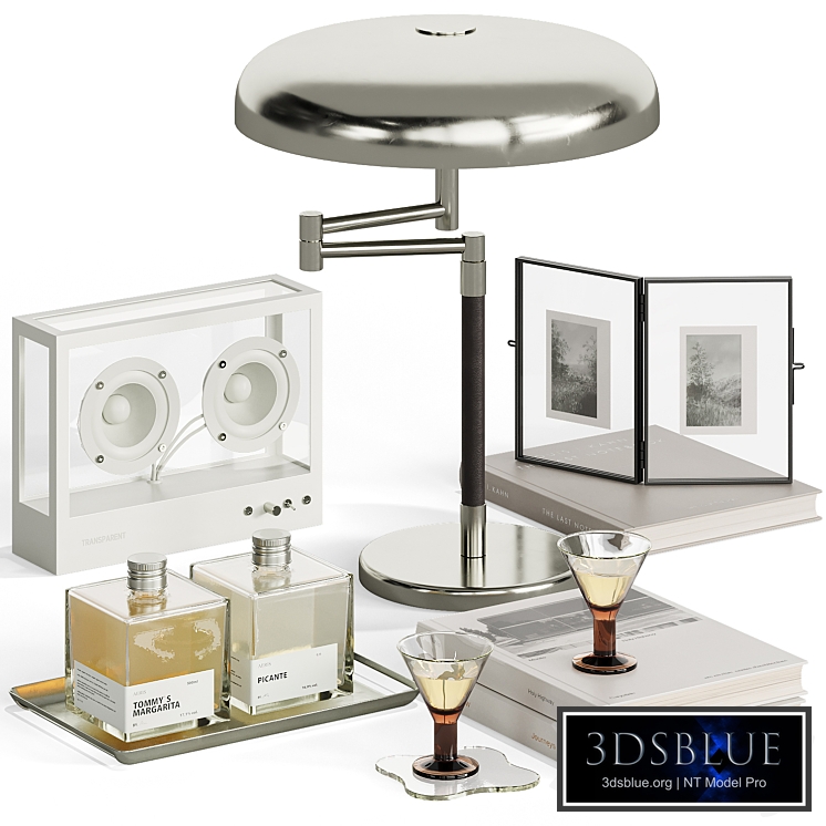 Decorative set with Ikea Art Deco Grimsö Table Lamp, record player and vintage glasses. Ikea Art Deco Grimsö Table Lamp https://www.pamono.eu/vintage-art-deco-grimsoe-table-lamp-from-ikea-1990s Transparent Speaker https://transpa.rent/us/small-transparent-speaker-white All my models are optimized, made for smoothing (where necessary), it is possible to regulate the number of iterations. Similar objects are multiplied via Instance, there is no unnecessary geometry and unjustifiably heavy maps. Archives are as light as possible without losing quality, objects and materials are logically named. The archive contains a 3ds max 2021 scene for Corona and V-Ray + fbx and obj files. Materials for Vray are created using Vray Converter. Renders for the preview were made in Corona Render 10. On the Corona Legacy Mtl. For Corona render, it is recommended to install version no lower than 1.5, since the glossiness of materials is configured taking into account PBR Those who work in V-Ray version lower than 3.1, be careful, in the materials in the BRDF section there is Microfaset GTR (GGX), if your version is older than 3.1, then the BRDF field will be empty. Select Blinn, Phong or Ward - what is preferable for you.
