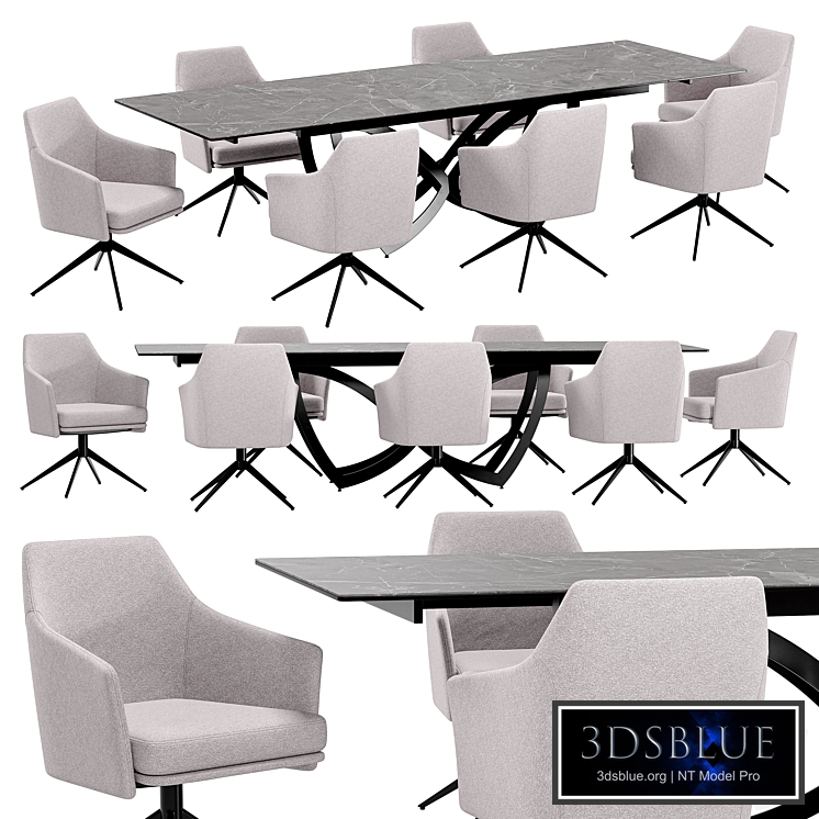 Ben chair: 630x585xH835mm https://hallberg.ru/product/stul-ben-s-podlokotnikami-svetlo-seryy Table Batterfly 200 pietra: 3000x1000x H760mm https://www.mebelaero.ru/catalog/product/stol-batterfly-200-pietra-grey/ Polys: 54,214 Verts: 27,658 Turbosmooth modifier with render iters mode applied on the required objects; There is an FBX file; For Corona render, it is recommended to install a version of at least 1.5, since the glossiness of materials is configured with PBR in mind.