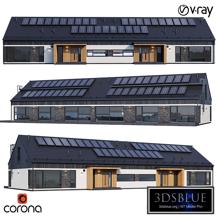 Model of a single-storey house - 30.45*13.80*7.07m - Interior walls with openings have been worked out - The model is made by one object - One multimaterial with names - Materials are all customized - Suitable for different angles - Archived models for V-ray and Corona - 3DsMax 2015/Fbx - Poly: 242456 - Vert: 265699 - Who works in a V-Ray version lower than 3.1 be careful, there is a Microfaset GTR ( GGX) in the materials in the BRDF section, if your version is older than 3.1, then the BRDF field will be empty. Choose Blinn, Phong or Ward – which is preferable for you - For Corona render, it is recommended to install a version not lower than 1.5, since the glossiness of materials is configured with PBR in mind