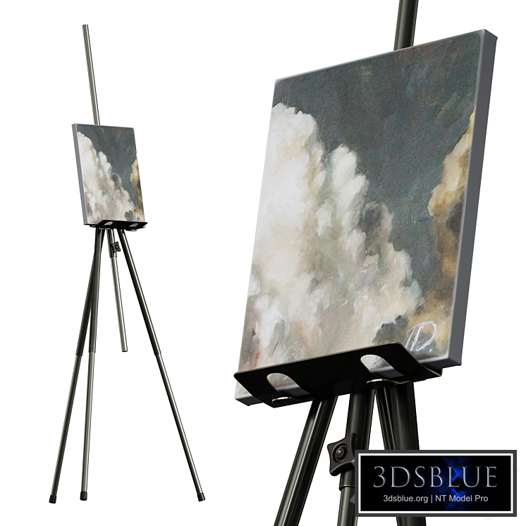 3D model of a metal easel with a painting. The easel is made of metal, placed on telescopic legs with a central tube adjustable in height. The painting with clouds depicted is a canvas on a wooden stretcher. The easel is equipped with a shelf for placing paints and brushes. Overall dimensions: 55cm x 45cm x 155cm The archive contains: all textures Material files for Vray, Corona and Fstorm. additional formats OBJ and FBX Number of polygons: 5429 Number of peaks: 5625