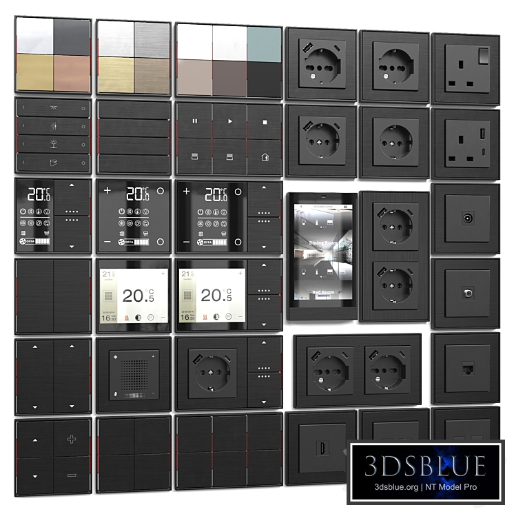 Ekinex FF Form series wall switches and sockets Objects: Light switch push button Schuko power socket Schuko power socket USB charger (type C & A) Power socket Italy Power socket Italy USB charger (type C & A) Power socket UK switched Power socket UK switched USB charger (type C & A) Room temperature control (thermostat) HDMI socket Antena soccket satellite socket vision control unit Touch & See control unit 2 channel push button 4 channel push button 6 channel push button Curtain control Voice assistant Plates Colors(plastic): 1. White 2. Intense black 3. Gray London 4. Cocoa orinoco 5. Green comodoro 6. Silver Colors(brushed): 1. Carbon brushed 2. Brass brushed 3. Aluminum brushed 4. Nickel brushed Colors(mirror finish): 1. Chrome 2. Black 3. Champagne 4. Copper Number of polygons: About 280k for the whole scene