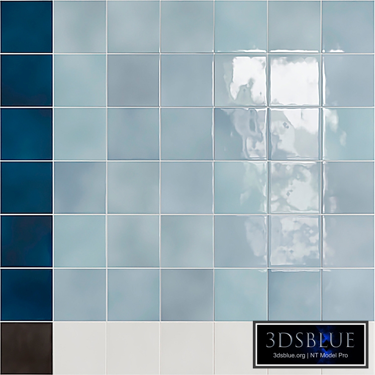 Wall tile "Manacor" from Equip (Spain) 100x100 mm. Thickness - 9 mm. https://www.equipeceramicas.com/en/portfolio-item/manacor/ There are 2 layout options in the scene - each with an area of about a square meter from unique tiles in all colors of the collection: - Basil green; - Beige agrile; - Black; - Blue moon; - Blush pink; - Glacier; -Mercury grey; - Mint - Ocean blue; -White The relief is made by geometry.