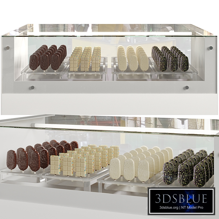 Eskimo and ice cream display case, for ice cream shops, with 4 varieties of eskimos, chocolate, vanilla, caramel with cereals L: 80 cm W: 130cm H: 95 cm Poly: 199 832 Vers: 202 974 https://www.youtube.com/watch?v=-61aIcrJE4c&ab_channel=AbdelhakZAIT