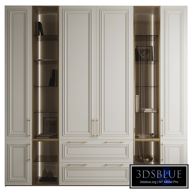 Classic cabinet with glass display cases and brass handles. The model is easy to edit. Each module is a separate object. The shop windows are filled with decor.