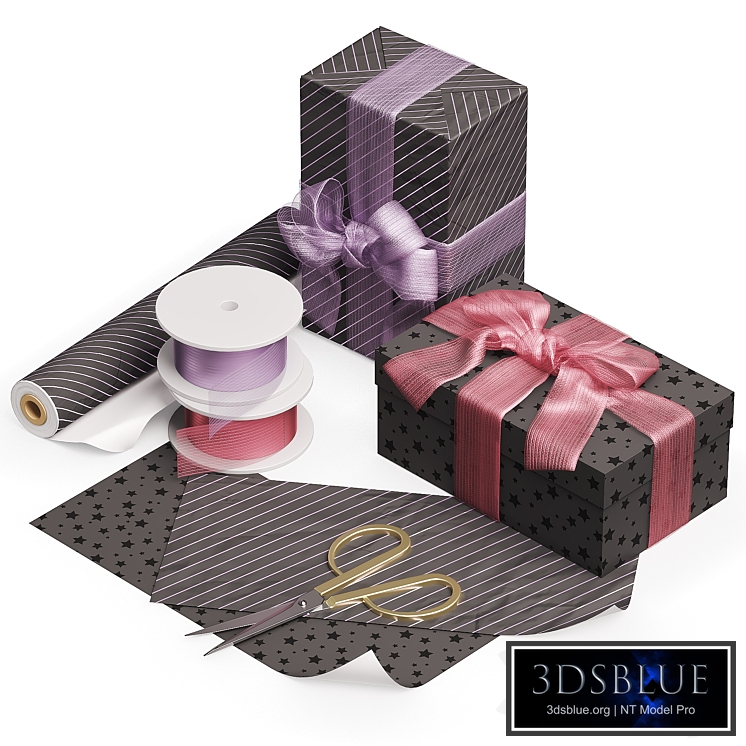 Gift wrapping set. Stylish set in discreet gray with metallic ribbons. The scene contains: - two rectangular boxes - two reels with tapes - a roll of wrapping paper - scissors The boxes are decorated with festive bows. Ribbon color: metallic red, metallic lilac. Scene details Format: 3Ds Max 2018 Export: FBX, OBJ, 3DS, MAT Render: Corona (5), VRay (5.x) Poly: 33855 Verts: 35609 Units: Millimeters Dimensions: 474 x 534 x 210 Texture formats: 1024*1024, 2048*2048 The model is named correctly, in Latin. The library of materials is saved. There are versions for Corona Render 2018 and for Vray Render 2018. Each object has its own layout. Enjoy using it!
