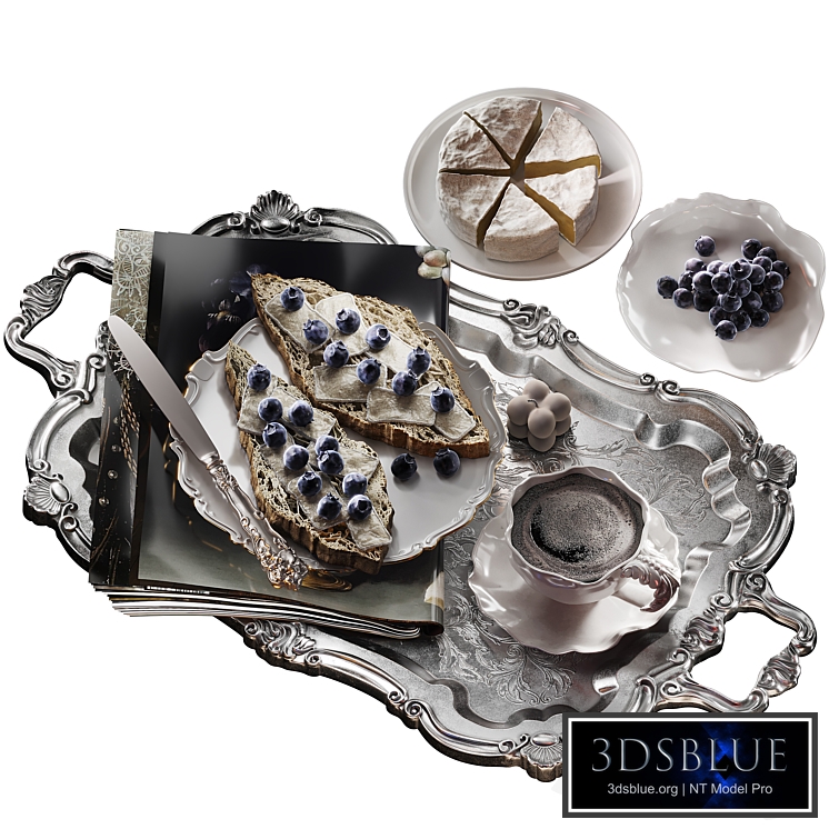Gourmet breakfast Gourmet breakfast • silver tray early 20th century Victorian era Victorian vintage antique silverplate sterling silver serving tray 1890 - 1900 • baguette / sandwich / bread / blue cheese / berries (blueberries) • butter/cheese knife antique sterling silver first half of 20th century modern art nouveau vintage • irregular shaped curve plate • glossy magazine with illustrations of paintings • cup of coffee (porcelain) • seashell shaped berry plate • candle "balls" • Camembert cheese / Brie cheese Suitable for close angles For correct and more detailed display It is recommended to set the parameter in the tab Render Setup - Performance - Displacement - Screen size 1.0 px Objects have correct Unwrap UVW mapping The export file contains objects without antialiasing.