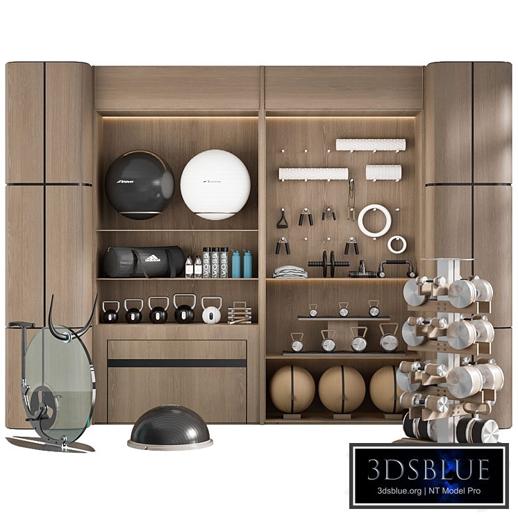 home gym /sports equipment https://3dsky.org/collection/shared/5389075 High-quality 3D model of a modern gym equipment storage unit featuring a complete set of fitness accessories: dumbbells, kettlebells, exercise balls, foam rollers, resistance handles, training bars, balance trainers, and water bottles. The wooden modular cabinet design with open shelves and compartments makes it perfect for home gyms, private studios, and professional fitness spaces. This model includes a separate dumbbell rack and multiple functional storage sections. Carefully detailed with realistic materials and clean topology, ready for rendering in both V-Ray and Corona formats Corona+Vary+Fbx ------- Polys:641.433 Verts:674.336