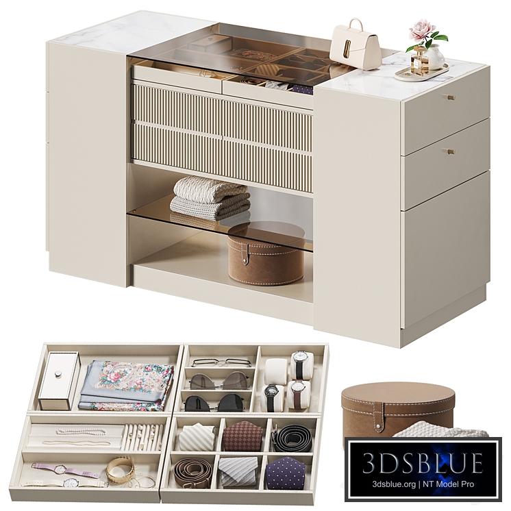 953 1530mm Commode Blanc Cassé Moderne avec Portes et Tiroirs Dressing Range pour Bijoux Overall dimensions of the island 60*84*153 cm https://fr.homary.com/item/60w-modern-off-white-dresser-with-doors-drawers-walk-in-closet-island-jewelry-storage-47183.html Drawers with accessories are grouped separately together with the filling, for convenient pulling out. The color of the furniture can be easily changed in the material settings! In the archive: MAX2016(corona/vray) + OBJ + mtl + Texture 97980 polygons (including decor) XForm, there is a scan. Pivot is configured. Turbosmooth is added to the decor (in the viewport - 0 iterations, on the render - 1 iteration), any decor element has a Turbosmooth instance. In OBJ, the stack is collapsed The model is suitable for a dressing room, bedroom, wardrobe. Dressing table, nightstand, chest of drawers, storage, decor, round box with stitching, leather, folded clothes, slats, slatted facade, dark glass, knitting, handbag, tray, vase with a rose. Filling ties, belt, wristwatch, jewelry, ring, bracelet, chain, beads, scarf, sunglasses, perfume, hand cream, jewelry box