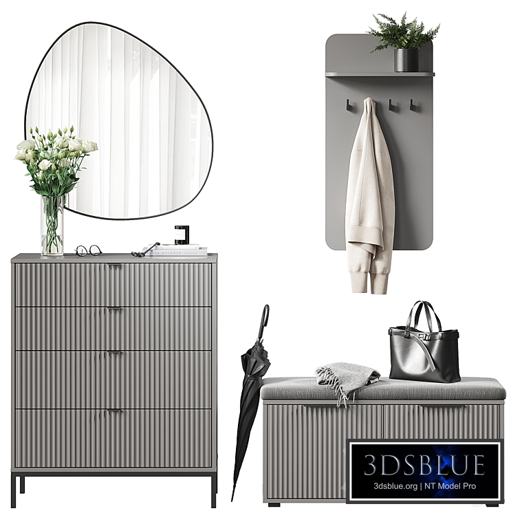 Furniture set for the hallway Divan.ru - Egil's Mirror https://www.divan.ru/product/zerkalo-nastennoe-egil-black - Chest of drawers Travis-1 https://www.divan.ru/product/komod-trejvis-1-grafit - Hanger Siris-1 https://www.divan.ru/product/veshalka-sajris-1-black polys: 443 502 verts: 479 595 contents: hallway furniture, hallway, hallway contents, jacket, hanger, clothes, clothes on a hanger, hook, bag, umbrella, bench, shoe rack, pouf, bench, bouquet, vase, flowers, eustoma, decor, books, candle, wick trimmer, glasses, scarf